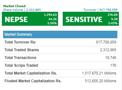 आइतबार नेप्से ४४.२६ अंकले बढेर १२९४.६५ अंकमा पुगेको छ । यसदिन १७६ कम्पनीको २३ लाख १२ हजार कित्ता सेयर ९१ करोड ७७ लाख रुपैयाँ बराबरमा किनबेच भयो । कारोबारमा आएका सबै समूहमा आएको सुधारले समग्र नेप्से तथा कारोबार रकममा वृद्धि आएको हो।