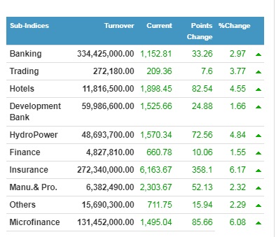 सेयरबजारमा उच्च सुधार आउँदा कारोबारमा आएकामध्ये १६२ कम्पनीको सेयरमूल्य बढेको छ भने १४ कम्पनीको मात्र घटेको छ । यसदिन ढेड दर्जन कम्पनीको सेयरमूल्य झण्डै दश प्रतिशतले बढेको छ । सूर्योदय लघुवित्त र महुली लघुवित्तको सेयरमूल्य दश प्रतिशतले बढेको छ । मिथिला लघुवित्त, निर्धन उत्थान, नेपाल लाइफ लगायतको सेयरमूल्य पनि नौ प्रतिशत बढीले उकालो लागेको छ । सबैभन्दा धेरै राधि विद्युतका लगानीकर्ताले तीन प्रतिशतका दरले गुमाए ।