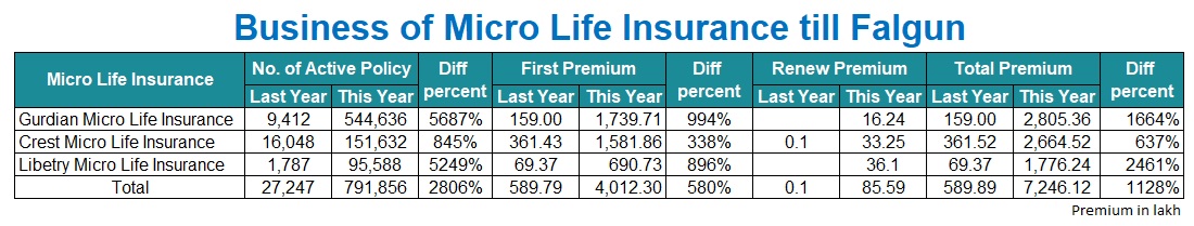 तथ्यांक अनुसार लघु जीवन बीमा कम्पनीको प्रिमियम संकलन ११ सय २८ प्रतिशतले र निर्जीवन लघु बीमा कम्पनीको प्रिमियम संकलन ४ सय ६१ प्रतिशतले बढेको छ । कम्पनीको प्रिमियम निवर्तमान बीमा प्राधिकरणका अध्यक्ष सूर्य सिलवालले लघु बीमा कम्पनीहरुलाई सञ्चालन अनुमति दिएर अहिले धमाधम आइपीओ निष्काशन प्रक्रियामा रहेका छन् ।