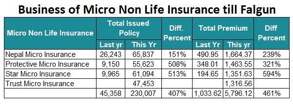 गत वर्ष निर्जीवन लघु विमा कम्पनीहरुले फागुनसम्म कुल ४३ हजार ३ सय ५८ वटा बीमा लेख जारी गरेकोमा चालु आवको फागुनसम्म यो ४ सय ७ प्रतिशतले बढेर २ लाख ३० हजार ७ वटा पुगेको छ