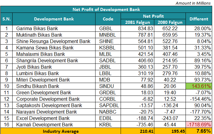 चालु आवको फागुनसम्म सबैभन्दा बढी नाफा वृद्धि दर सिन्धु विकास बैंकको देखिएको छ। बैंकले गत वर्ष फागुनसम्म २ करोड १ लाख रुपैयाँ मात्रै खुद नाफा गरेकोमा चालु आवको फागुनसम्म ४ करोड ८९ लाख रुपैयाँ खुद मुनाफा गरेको थियो। त्यस्तै मितेरी डेभलपमेन्ट बैंकले गत वर्ष ४ करोड २ लाख रुपैयाँ खुद मुनाफा गरेकोमा चालु आवको फागुनसम्ममा झन्डै सात प्रतिशत नाफा वृद्धि गरी ७ करोड ७९ लाख रुपैयाँ पुर्याएको छ। गत वर्ष फागुनसम्म सांग्रिला डेभलपमेन्ट बैंकले २१ करोड ४९ लाख रुपैयाँ नाफा गरेकोमा चालु आवको फागुनसम्ममा ८९ दशमलब १६ प्रतिशतले नाफा वृद्धि गरी ४० करोड ६६ लाख रुपैयाँ पुर्याएकाे छ।