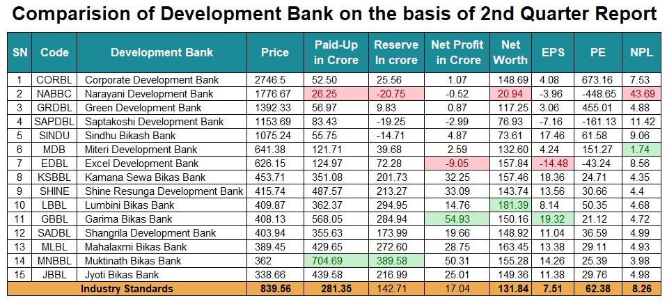 वित्तीय अवस्था जस्तोसुकै भए पनि १ अर्ब रुपैयाँ भन्दा कम चुक्ता पुँजी भएका विकास बैंकहरुको शेयर मूल्य अपरेटरहरुले १ हजार रुपैयाँ भन्दा माथि नै कायम राखेका छन् । कर्पोरेट, नारायणी, ग्रिन, सप्तकोशी र सिन्धु ५ वटै विकास बैंकको चुक्ता पुँजी १ अर्ब रुपैयाँ भन्दा कम छ र नेप्सेमा यी पाँचै वटा विकास बैंकको शेयर मूल्य १ हजार रुपैयाँ माथि छ । ५ मध्ये ३ वटा विकास बैंकको नेटवर्थ १ सय रुपैयाँ भन्दा पनि तल छ । यसको अर्थ कथकदाचित बैंक खारेजीमा गएमा लगानीकर्ताले अंकित मूल्य भन्दा पनि कम मात्रै पैसा पाउने अवस्था छ ।
