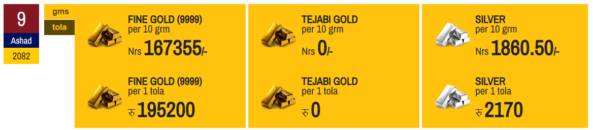 नेपाल सुनचाँदी व्यवसायी संघका अनुसार यस दिन छापावाल सुन प्रतितोला एक लाख ९५ हजार २०० रुपैयाँमा कारोबार भइरहेको छ । यस दिन चाँदीको मूल्य भने तोलामा १० रुपैयाँले बढेको छ । यस दिन चाँदी प्रतितोला दुई हजार १७० रुपैयाँमा कारोबार भईरहेको छ । आईतबारको बजारमा चाँदी प्रतितोला दुई हजार १६० रुपैयाँमा कारोबार भएको थियो ।
