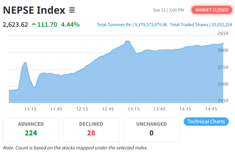 आइतबार नेप्से परिसूचक १११.७० अंक बढेर २६२३.६२ विन्दुमा पुगेको छ। त्यस्तै, यस दिन सेन्सेटिभ इण्डेक्स १९.०७ अंक बढेको छ भने फ्लोट इण्डेक्स ७.५३ अंक र सेन्सेटिभ फ्लोट इण्डेक्स ६.२५ अंक बढेको छ।