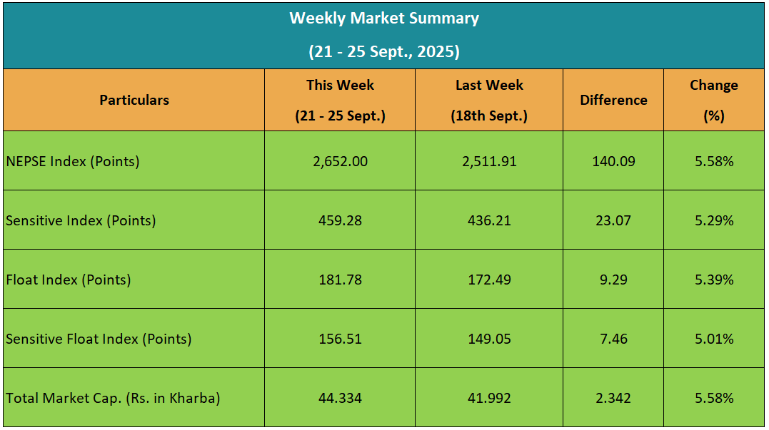 यस साता ४ कारोबार दिनका लागि बजार खुलेको थियो। जसमध्ये २ करोबार दिन नेप्से बढेको थियो भने २ कारोबार दिन नेप्से घटेर बन्द भएको थियो।