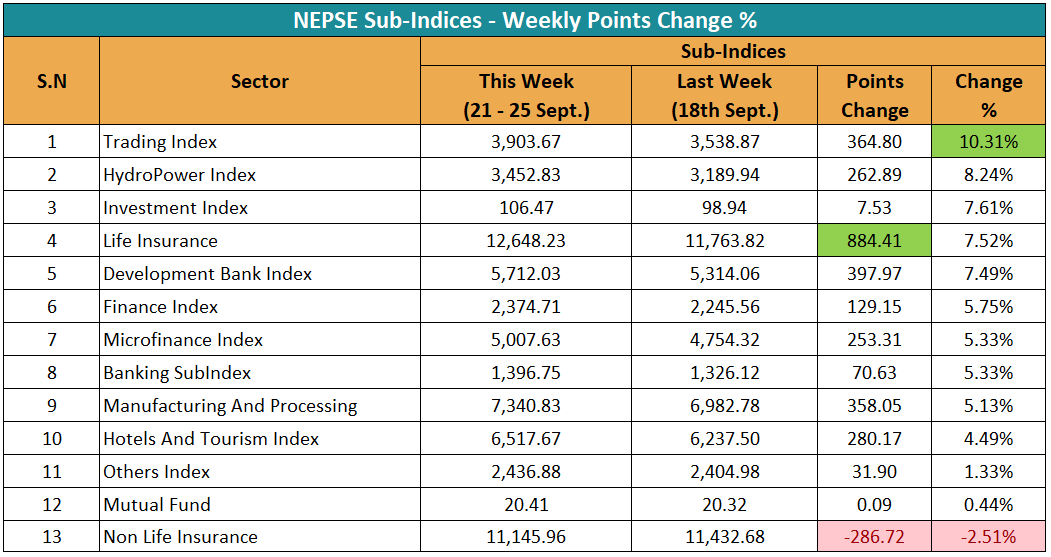 यस साता १३ वटा उपसमूहमध्ये १२ उपसमूहको परिसूचक बढेको छ भने एक उपसमूहको परिसूचक घटेको छ। यस साता व्यापार उपसमूहको परिसूचक सर्वाधिक १०.३१ प्रतिशत बढेको छ। गत साता ३५३८.८७ विन्दुमा बन्द भएको यस उपसमूहको परिसूचक, यस साता ३६४.८० अंक बढेर ३९०३.६७ विन्दुमा पुगेको छ। अंकका आधारमा भने यस साता जीवन बीमा उपसमूहको परिसूचक सर्वाधिक ८८४.४१ अंक बढेको छ।