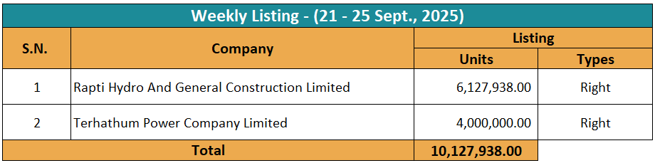 नेप्सेमा यस साता कुल १ करोड १ लाख २७ हजार ९३८ कित्ता शेयर सूचीकृत भएको छ। यस साता राप्ती हाइड्रो एण्ड जनरल कन्स्ट्रक्सनको ६१ लाख २७ हजार ९३८ कित्ता र तेह्रथुम पावरको ४० लाख कित्ता हकप्रद शेयर नेप्सेमा सूचीकृत भएको हो।