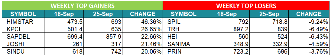 यस साता हिम स्टार उर्जा कम्पनीको शेयरमूल्य सर्वाधिक ४६.३६ प्रतिशत बढेको छ। गत साता ४७३ रुपैयाँ ५० पैसा रहेको यस कम्पनीको अन्तिम मूल्य, यस साता ६९३ रुपैयाँ रहेको छ। त्यस्तै, यस साता कालिका पावरको शेयरमूल्य साढे २६ प्रतिशतभन्दा बढी बढेको छ भने सप्तकोशी डेभलपमेन्ट बैंकको शेयरमूल्य साढे २२ प्रतिशतभन्दा बढी बढेको छ। यस साता सिद्धार्थ प्रिमियर इन्स्योरेन्सको शेयरमूल्य सर्वाधिक ९.२४ प्रतिशत घटेको छ।