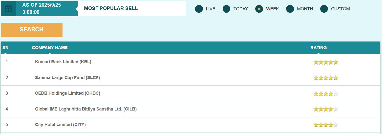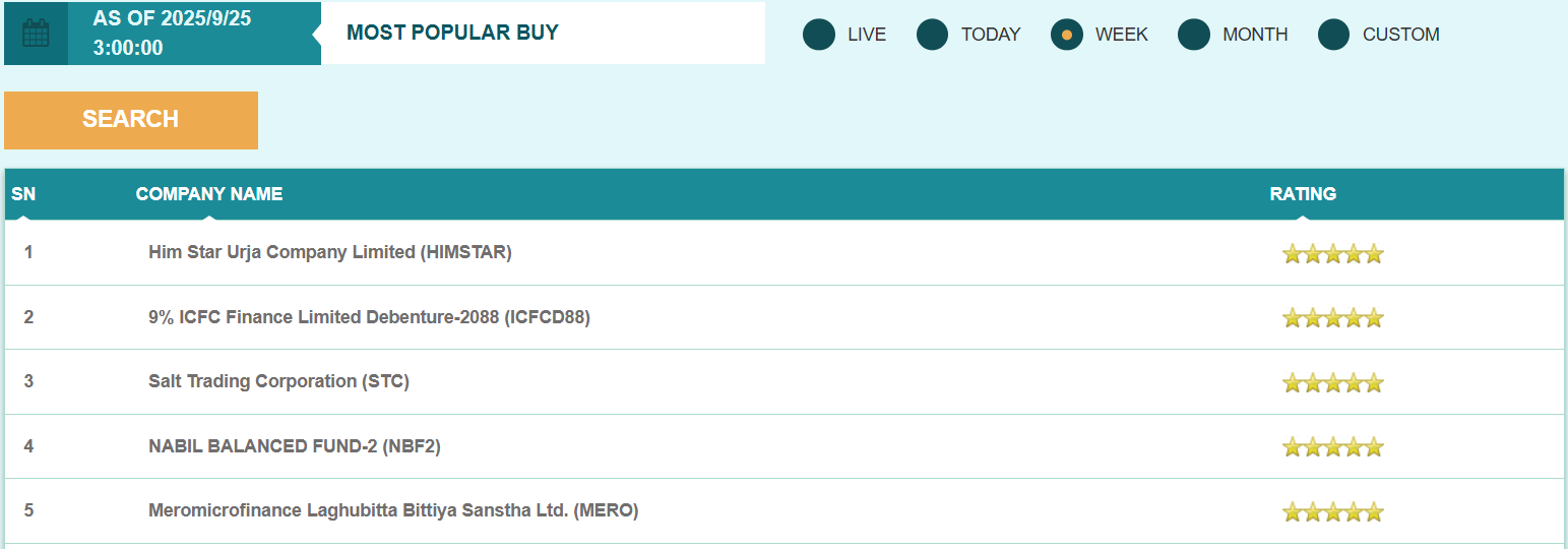फ्लोरसिट विश्लेषण गर्दा यस साता हिम स्टार उर्जा कम्पनी, ९ प्रतिशत आईसीएफसी फाइनान्स लिमिटेड ऋणपत्र २०८८, साल्ट ट्रेडिङ्ग कर्पोरेशन लगायतका स्टकहरु मोस्ट पपुलर बाइ स्टक सूचीको शीर्ष स्थानमा रहेका छन् भने कुमारी बैंक, सानिमा लार्ज क्याप फण्ड, सिईडिबि होल्डिङ्गस लगायतका स्टकहरु मोस्ट पपुलर सेल स्टक सूचीको शीर्ष स्थानमा रहेका छन्।