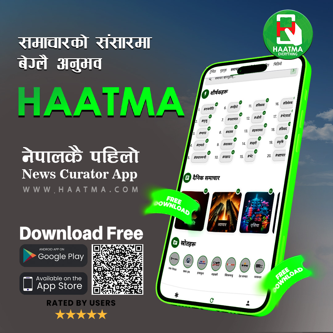 आईओएस र एन्ड्रोइड दुवै भर्सनमा उपलब्ध छ । Haatma एप न्युज एग्रिटेर मात्र नभई न्युज क्युरेटर पनि हो । एआई र ह्युमन इन्टेलिजेन्सको एकसाथ प्रयोगबाट एकत्रित गरिएका समाचार तथा भिडियोहरु तपाईंहरुले संक्षेप र विस्तृत दुवै रुपमा पाउन सक्नुहुने छ । नेपाली र अंग्रेजी भाषामा समाचार उपलब्ध हुने यो एपमा अहिलेसम्म चार दर्जनभन्दा बढी सञ्चारगृह जोडिएका छन्, थप उत्तिकै संख्यामा जोडिने प्रक्रियामा छन् ।