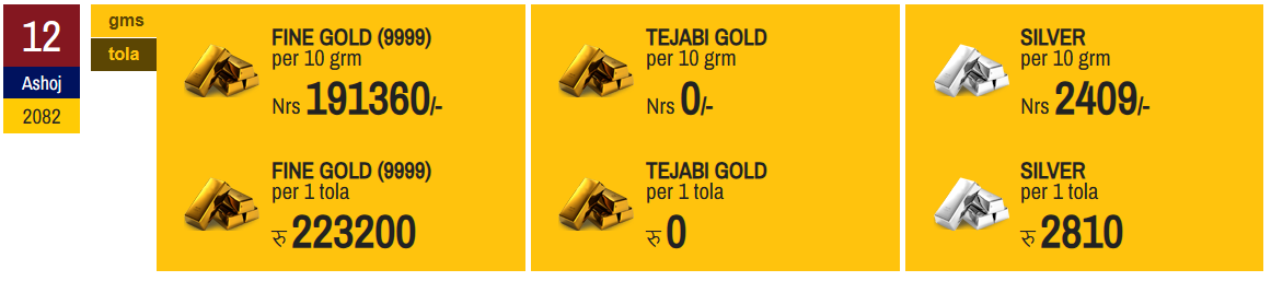 असोज १२ गते, आईतबार,नेपाली बजारमा सुन र चाँदीको मूल्यले रेकर्ड ब्रेक गरेको छ । यस दिन सुन प्रतितोला ७०० रुपैयाँ र चाँदी तोलामा ७० रुपैयाँ बढेर रेकर्ड ब्रेक गरेको हो ।