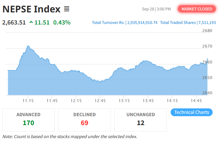आइतबार नेप्से परिसूचक ११.५१ अंक बढेर २६६३.५१ विन्दुमा पुगेको छ। त्यस्तै, यस दिन सेन्सेटिभ इण्डेक्स ३.२२ अंक बढेको छ भने फ्लोट इण्डेक्स १.१७ अंक र सेन्सेटिभ फ्लोट इण्डेक्स १.१० अंक बढेको छ।