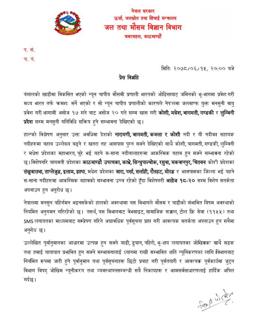 असोज १७ गतेबाट असोज २० गतेसम्मकाे वर्षाले विशेषगरी वागमती प्रदेशका काठमाडौं उपत्यकासहित काभ्रे, सिन्धुपाल्चोक, रसुवा, मकवानपुर, चितवनमा बाढी, पहिरो र डुबानको जोखिम हुने जनाइएको छ ।