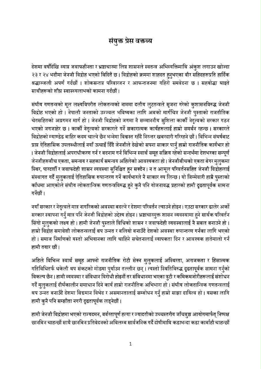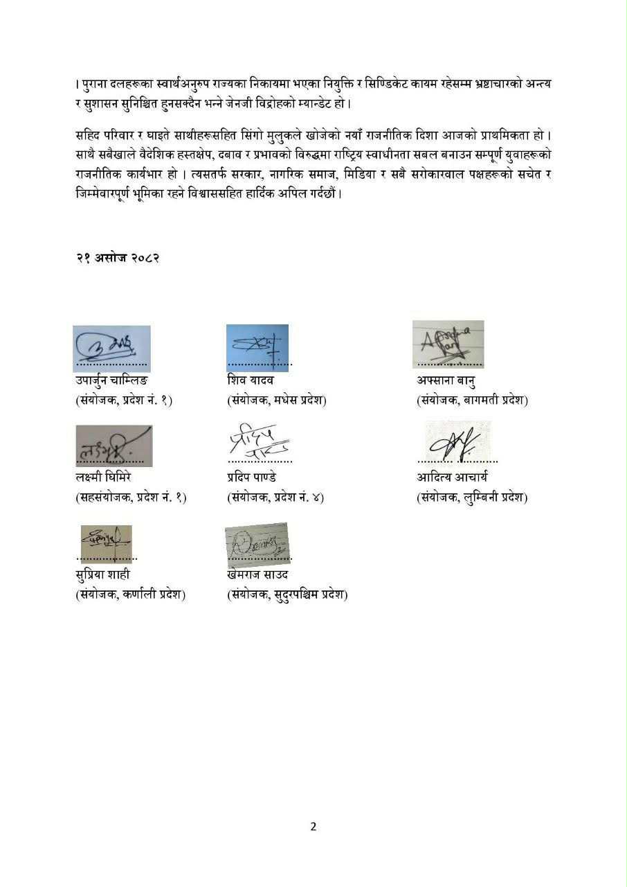 जेनजी आन्दोलनका सातै प्रदेशका संयोजकहरूले विज्ञप्ति जारी गरी पुराना दलका स्वार्थअनुसार राज्यका निकायमा नियुक्ति भएसम्म भ्रष्टाचारको अन्त्य र सुशासन सुनिश्चित नहुने बताएको छ।