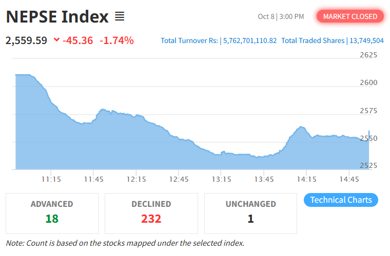 बुधबार नेप्से परिसूचक ४५.३६ अंक घटेर २५५९.५९ विन्दुमा झरेको छ। त्यस्तै, यस दिन सेन्सेटिभ इण्डेक्स ८.१५ अंक घटेको छ भने फ्लोट इण्डेक्स ३.४१ अंक र सेन्सेटिभ फ्लोट इण्डेक्स ३.०४ अंक घटेको छ।