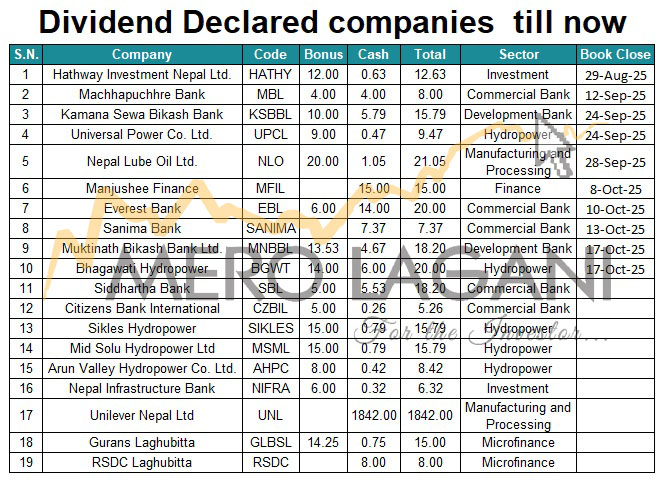सधैंजसो धेरै लाभांश घोषणा गर्ने कम्पनीमा युनिलिभर नेपाल रहेको छ । कम्पनीले गत वर्षको नाफाबाट १८ सय ४२ प्रतिशत नगद लाभांश घोषणा गरेको छ । कम्पनीले अहिलेसम्म बुक क्लोजको सूचना भने निकालेको छैन । अहिलेसम्म लाभांश घोषणा कम्पनीहरुमध्ये हाथवे इन्भेष्टमेन्ट नेपालले गत भदौ ३१ गते साधारण सभा सम्पन्न गरिसकेको छ भने माछापुच्छ्रे बैंकले भदौ २७ गते बुक क्लोज गरिसकेको छ। माछापुच्छ्रे बैंकले असोज १० गते साधारण सभा सम्पन्न गरेको छ । कामना सेवा विकास बैंक र युनिभर्सल पावर कम्पनी लिमिटेडले असोज ८ गते बुक क्लोज गरिसकेको छ । कामना सेवाले असोज २४ गते तथा युनिभर्सल पावरले असोज २३ गते साधारण सभा मिति तय गरेका छन्।