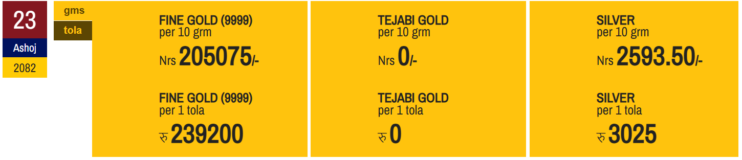 यसैगरी, यस दिन चाँदीको मूल्य भने ७० रुपैयाँले बढेर ऐतिहासिक उचाई बनाएको छ । बिहीबारको बजारमा चाँदी प्रतितोला तीन हजार २५ रुपैयाँमा खरिद बिक्री भइरहेको छ । बुधबार चाँदी दुई हजार ९५५ रुपैयाँमा कारोबार भएको थियो ।