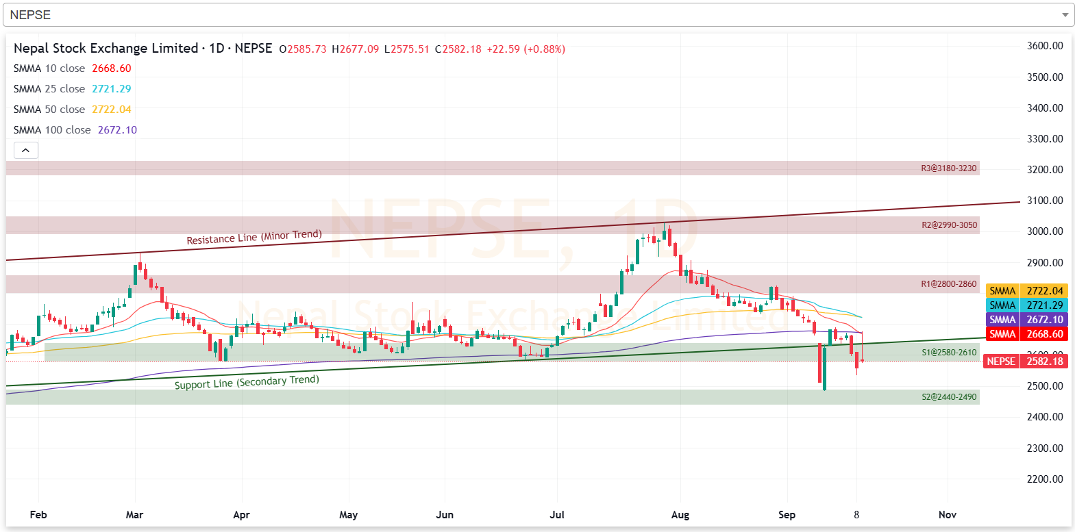 गत साता नेप्से घटेर टेवा क्षेत्रमा झरेको छ। हाल नेप्सेको टेवा क्षेत्र २५८० देखि २६१० सम्म रहेको छ। आगामी दिनमा नेप्सेले सो क्षेत्रमा टेवा पाएर उकालो लागेमा २८०० देखि २८६० को क्षेत्रमा प्रतिरोधको सामना गर्ने देखिन्छ।