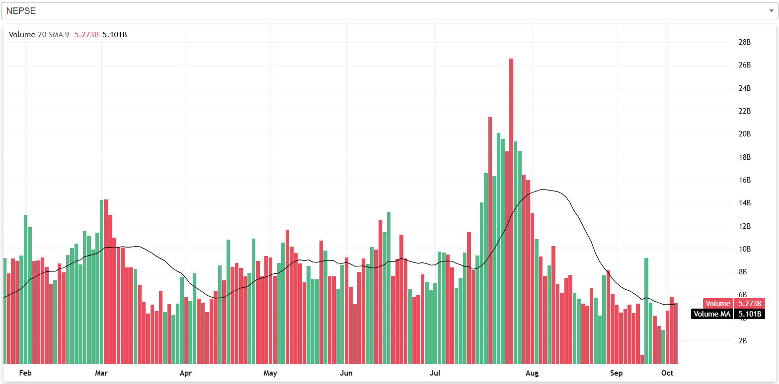 गत साता नेप्सेको भोल्यूम भने बलियो रहेको छ। गत साता नेप्सेमा दैनिक औषतमा ५ अर्ब २२ करोडको शेयर कारोबार भएको थियो। साताको अन्तिम कारोबार दिन नेप्सेको २० दिने औषत भोल्यूम ५ अर्ब १० करोड रहेको छ। २० दिने औषत भोल्यूमको तुलनामा गत साताको दैनिक औषत भोल्यूम २.३५ प्रतिशत बढी हो।