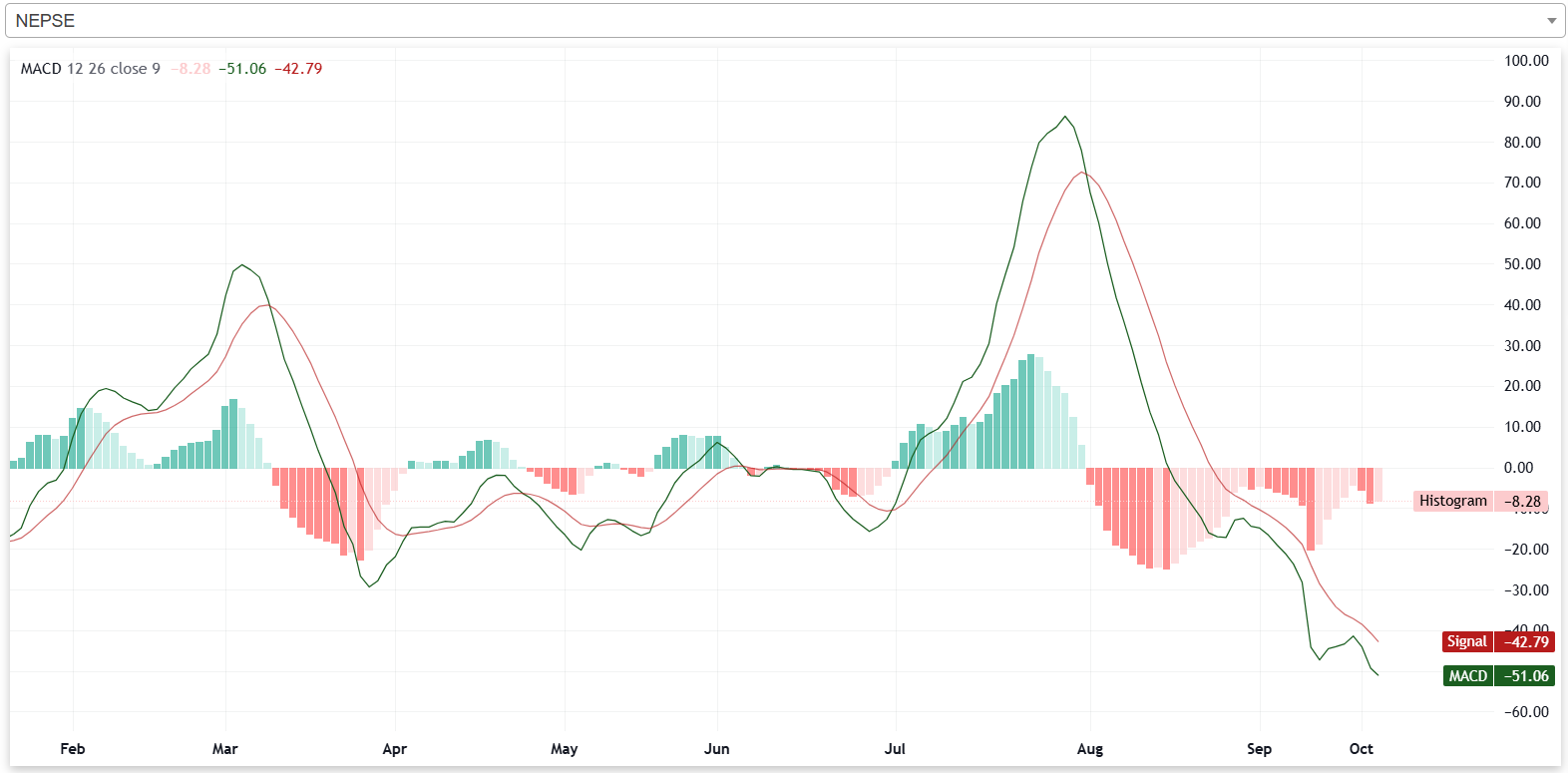 गत साता नेप्से परिसूचक बियरिश प्रवृत्तिमा रहेको छ। गत साता नेप्सेको एमएसिडी रेखा, सिग्नल रेखाभन्दा तल रहेको छ। साथै, यी दुबै रेखाहरु नकारात्मक क्षेत्रमा रहेका छन्। गत साता नेप्सेको हिस्टोग्रामको उचाई पनि नकारात्मक क्षेत्रमा बढ्दो क्रममा रहेको छ।