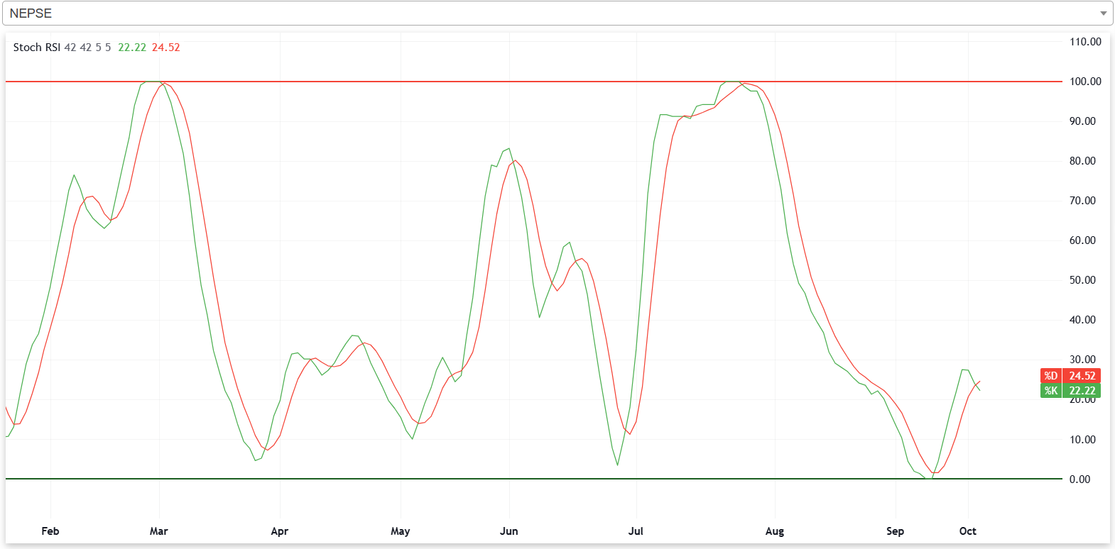 गत साता नेप्सेको स्टकास्टिक आरएसआई ओभरसोल्ड जोन रहेको छ। यसले गत साता बजारमा खरिदचापको तुलनामा बिक्रीचाप बढी रहेको संकेत गर्दछ।