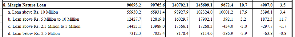 भदौको रिपोर्टअनुसार ५० लाख रुपैयाँदेखि एक करोड रुपैयाँ भन्दा बढीको ऋण सबैभन्दा धेरै बढेको छ। केन्द्रीय बैंकले संस्थागत लगानीकर्तालाई ऋणको सीमा खारेज गरिदिएपछि यस्तो ऋण बढेको हो। भदौमा ५० लाख रुपैयाँदेखि एक करोड रुपैयाँसम्मको ऋण ११.७ प्रतिशतले बढेको छ। दोस्रोमा एक करोड भन्दा बढी ऋणको ग्रोथ बढेको छ। भदौमा एक करोड भन्दा बढी ऋण ३.४ प्रतिशतले बढेको छ। २५ लाख रुपैयाँ देखि ५० लाख रुपैयाँ र २५ लाख रुपैयाँ भन्दा कमको ऋणको ग्रोथ भने घटेको छ। २५ लाख रुपैयाँ देखि ५० लाख रुपैयाँसम्मको ऋण १.७ प्रतिशतले घटेको छ भने २५ लाख भन्दा मुनिको ऋण ०.८ प्रतिशतले घटेको छ।