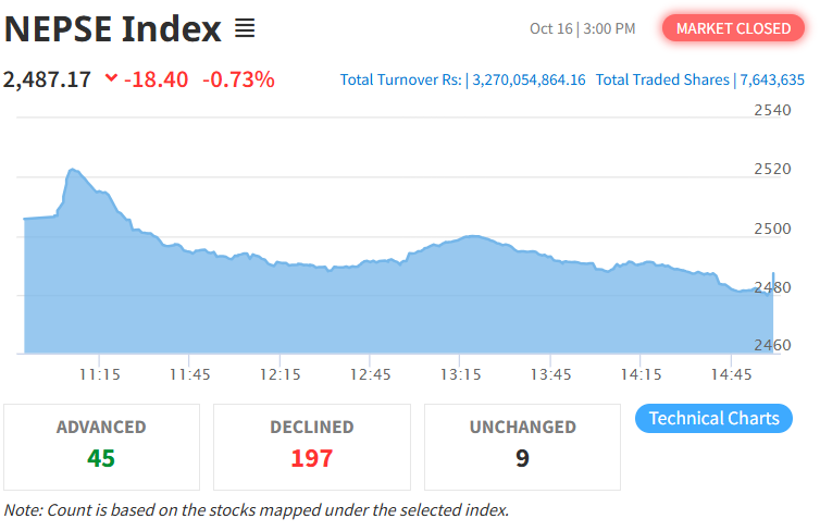 बिहीबार नेप्से परिसूचक १८.४० अंक घटेर २४८७.१७ विन्दुमा झरेको छ। त्यस्तै, यस दिन सेन्सेटिभ इण्डेक्स १.७३ अंक घटेको छ भने फ्लोट इण्डेक्स १.१६ अंक र सेन्सेटिभ फ्लोट इण्डेक्स ०.६२ अंक घटेको छ।