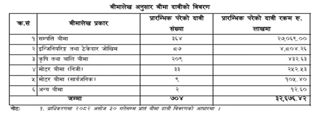 विभिन्न १३ वटा निर्जीवन बीमा कम्पनी र २ वटा लघु निर्जीवन बीमा कम्पनीमा परेका कुल ७०४ वटा बीमा दाबीको करिव ३ अर्ब २६ करोड ७६ लाख दाबी परेको जानकारी निर्जीवन बीमा कम्पनीहरूबाट प्राप्त भएको प्राधिकरणले जनाएको छ ।