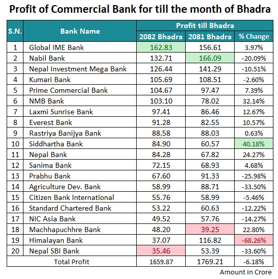 राष्ट्र बैंकका अनुसार दुई महिनामा १० वटा बैंकको नाफा घटेको छ भने १० वटाको बढेको छ। समीक्षा अवधिमा सबैभन्दा धेरै नाफा बढेको बैंकमा क्रमशः सिद्धार्थ बैंक, एमएबी बैंक, नेपाल बैंक, माछापुच्छ्रे बैंक र लक्ष्मी सनराइज बैंक रहेका छन् । यी बैंकहरुको नाफा अधिकतम ४० प्रतिशतसम्म बढेको तथ्यांकमा देखिएको छ । त्यस्तै नाफा धेरै घटेको बैंकहरुमा क्रमशः हिमालयन बैंक, नेपाल एसबीआई बैंक, कृषि विकास बैंक, प्रभु बैंक र नबिल बैंक रहेका छन् । यी बैंकहरुको नाफा अधिकतम ६८ प्रतिशतसम्म घटेको छ ।