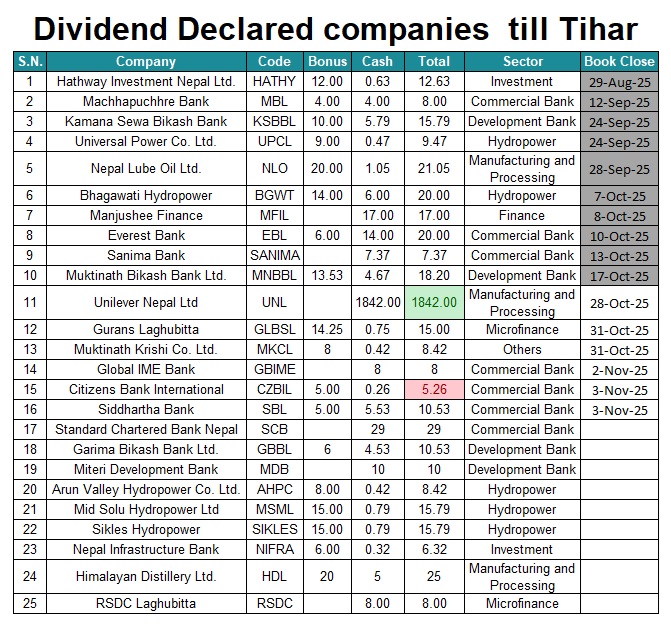 सधैंजसो धेरै लाभांश घोषणा गर्ने कम्पनीमा युनिलिभर नेपाल रहेको छ । कम्पनीले गत वर्षको नाफाबाट १८ सय ४२ प्रतिशत नगद लाभांश घोषणा गरेको छ । कम्पनीले अहिलेसम्म बुकक्लोजको सूचना भने निकालेको छैन । अहिलेसम्म लाभांश घोषणा कम्पनीहरुमध्ये हाथवे इन्भेष्टमेन्ट नेपालले गत भदौ ३१ गते साधारण सभा सम्पन्न गरिसकेको छ भने माछापुच्छ्रे बैंकले असोज १० गते साधारण सभा गरेर नगद लाांश समेत वितरण गरिसकेको छ । कम्पनीले ४ प्रतिशत नगद र ४ प्रतिशत बोनस गरी कुल ८ प्रतिशत लाभांश घोषणा गरेको थियो।