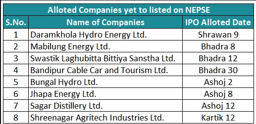 नेप्सेको सूचीकरण विभागले दिएको जानकारी अनुसार अहिले सात कम्पनी सूचीकरणको लाइनमा छन्। उनीहरूले धेरै अघि देखि नै निवेदन दिएका हुन्। तर सूचीकरणको लागि नेप्से प्रमुखको हस्ताक्षर आवश्यक पर्छ। प्रमुख नहुँदा सूचीकरण हुन सक्दैन। एक महिना यता नेप्से प्रमुख कार्यालय आएका थिएनन्। जसले गर्दा सूचीकरण हुन सकिरहेको थिएन।