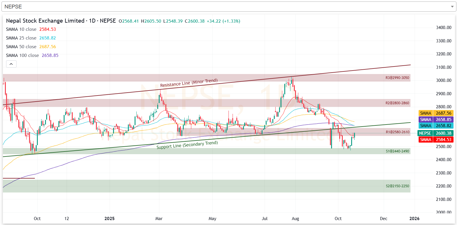 गत साता नेप्से बढेर प्रतिरोध क्षेत्रमा पुगेको छ। हाल नेप्सेको प्रतिरोध क्षेत्र २५८० देखि २६१० सम्म रहेको छ। आगामी दिनमा नेप्सेले सो क्षेत्रमा प्रतिरोधको सामना गरी ओरालो लागेमा २४४० देखि २४९० को क्षेत्रमा टेवा पाउने देखिन्छ। तर, सो प्रतिरोध क्षेत्र तोडेर उकालो लागेमा २८०० देखि २८६० को क्षेत्रमा प्रतिरोधको सामना गर्ने देखिन्छ।