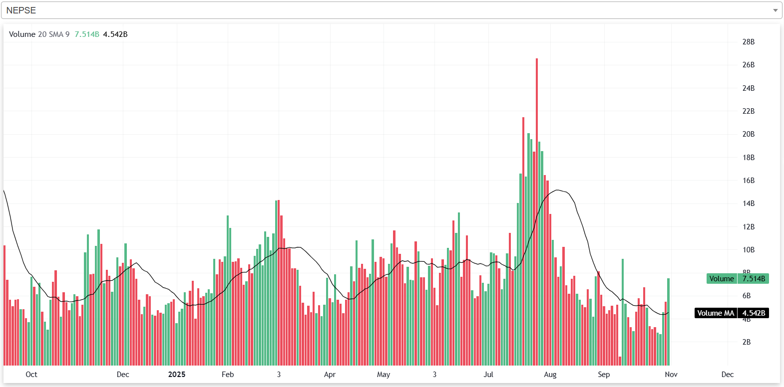 गत साता नेप्सेको भोल्यूम भने बलियो रहेको छ। गत साता नेप्सेमा दैनिक औषतमा ५ अर्ब ५ करोडको शेयर कारोबार भएको थियो। साताको अन्तिम कारोबार दिन नेप्सेको २० दिने औषत भोल्यूम ४ अर्ब ५४ करोड रहेको छ। २० दिने औषत भोल्यूमको तुलनामा गत साताको दैनिक औषत भोल्यूम ११.२३ प्रतिशत बढी हो।