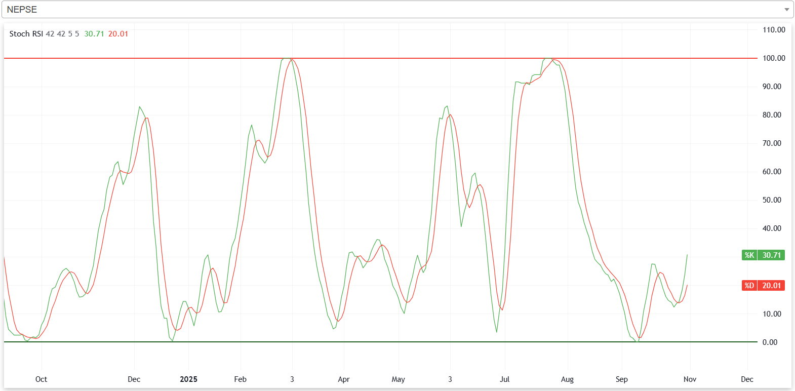 गत साता नेप्सेको स्टकास्टिक आरएसआई ओभरसोल्ड जोन रहेको छ। यसले गत साता बजारमा खरिदचापको तुलनामा बिक्रीचाप बढी रहेको संकेत गर्दछ।