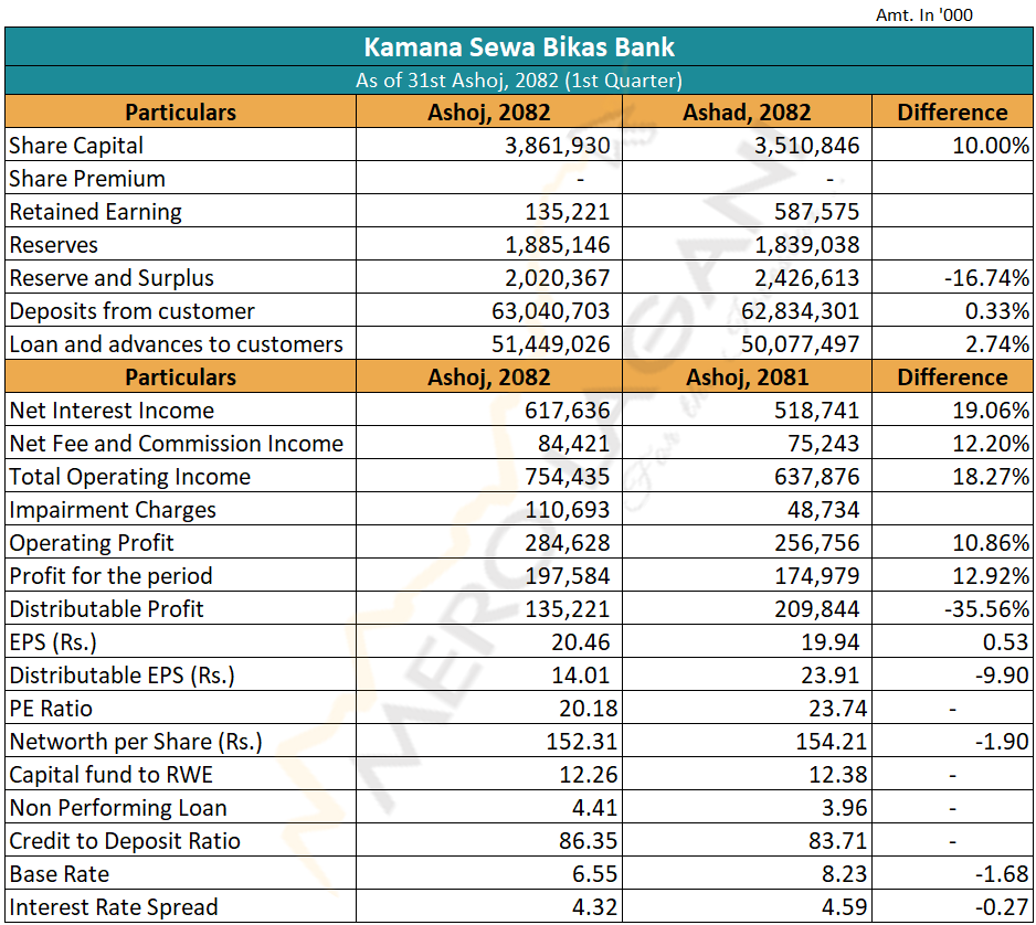 नाफा बढेपनि बैंकको वितरणयोग्य मुनाफा भने घटेको छ। असोज मसान्तसम्ममा बैंकको वितरणयोग्य मुनाफा ३५.५६ प्रतिशत घटेको छ। बैंकको निष्क्रिय कर्जा भने समीक्षा अवधिमा ३.९६ प्रतिशतबाट बढेर ४.४१ प्रतिशत पुगेको छ। जसका कारण इम्पेरमेन्ट चार्ज पनि ४ करोड ८७ लाख रुपैयाँबाट बढेर ११ करोड ६ लाख रुपैयाँ पुगेको छ।