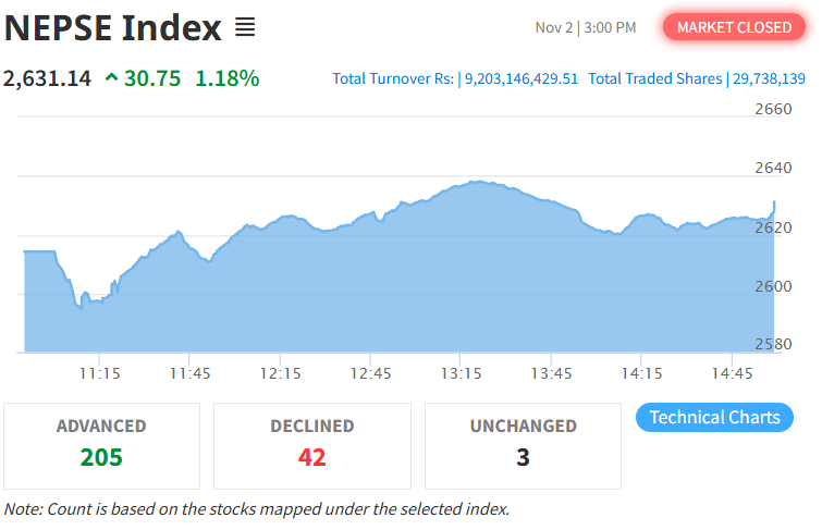 आइतबार नेप्से परिसूचक ३०.७५ अंक बढेर २६३१.१४ विन्दुमा पुगेको छ। त्यस्तै, यस दिन सेन्सेटिभ इण्डेक्स ४.४१ अंक बढेको छ भने फ्लोट इण्डेक्स २.२० अंक र सेन्सेटिभ फ्लोट इण्डेक्स १.२३ अंक बढेको छ।