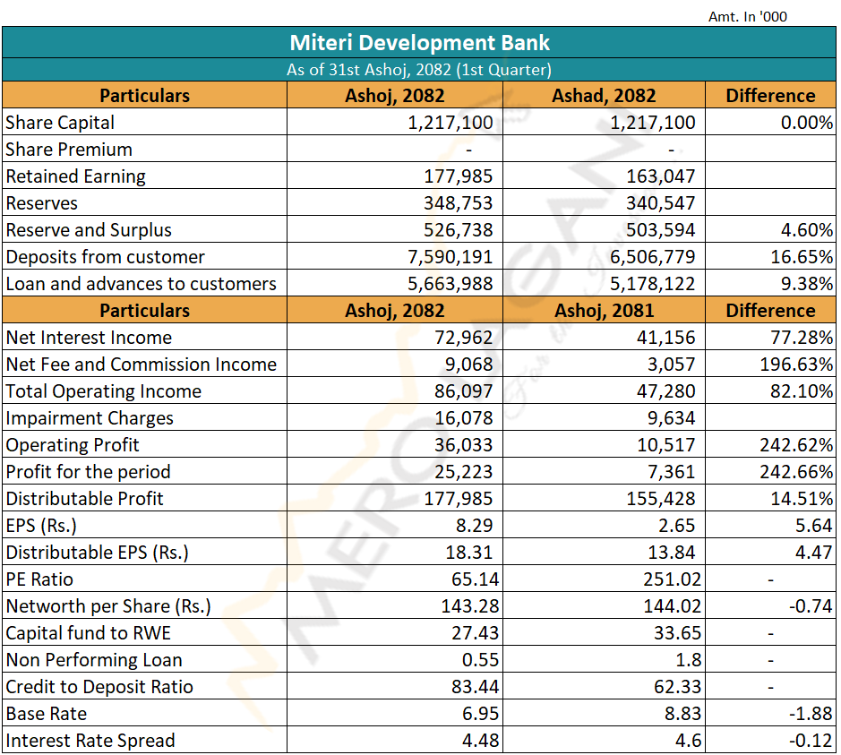 समीक्षा अवधिमा बैंकको खुद ब्याज आम्दानी ७७.२८ प्रतिशत बढेको छ भने खुद फि तथा कमिशन आम्दानी १९६.६३ प्रतिशत बढेको छ। त्यस्तै, बैंकको सञ्चालक आम्दानी ८२.१० प्रतिशत र सञ्चालन मुनाफा २४२.६२ प्रतिशत बढेको छ। सो अवधिसम्ममा बैंकको वितरणयोग्य मुनाफा १७ करोड ७९ लाख रुपैयाँ रहेको छ भने वितरणयोग्य प्रतिशेयर आम्दानी १८ रुपैयाँ ३१ पैसा रहेको छ।