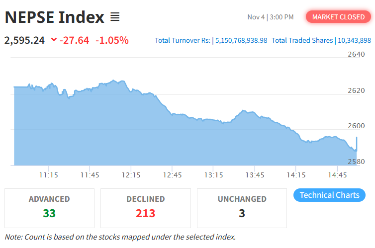 यस दिन नेप्से परिसूचक २७.६४ अंक घटेर २५९५.२४ विन्दुमा झरेको छ। त्यस्तै, यस दिन सेन्सेटिभ इण्डेक्स ३.९३ अंक घटेको छ भने फ्लोट इण्डेक्स १.९१ अंक र सन्सेटिभ फ्लोट इण्डेक्स १.३० अंक घटेको छ।