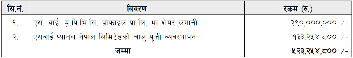 कम्पनीले सार्वजनिक निष्काशनबाट प्राप्त भएको रकम मध्येको केही रकम चालु पूँजी व्यवस्थापनको लागि उपयोग गर्ने भएकोले उक्त चालु पूँजी व्यवस्थापनमा प्रयोग हुने रकमको सम्बन्धमा अघिल्लो आर्थिक वर्ष २०८१/८२ को तुलनामा कम्पनीको व्यापार विस्तारका लागि यस आर्थिक वर्ष २०८२÷८३ का लागि प्रक्षेपित चालु पूँजी १३ करोड ३२ लाख ५४ हजार ८०० रुपैयाँ आवश्यकता रहनेछ। उक्त रकम व्यापार प्राप्तिको व्यवस्थापनको र स्टक मौज्दात व्यवस्थापनको लागी प्रयोग गरिने कम्पनीले बताएको छ। कम्पनी सञ्चालनको लागि समय समयमा व्यापारको आकार अनुसार चालु पूँजी व्यवस्थापन बापतको रकम आवश्यकता पर्ने हुन्छ। कम्पनीले बाँकी रहेको ३९ करोड रुपैयाँ एसवाई युपिभिसि प्रोफाइल प्रा.लि. मा शेयर लगानी गर्नेछ।
