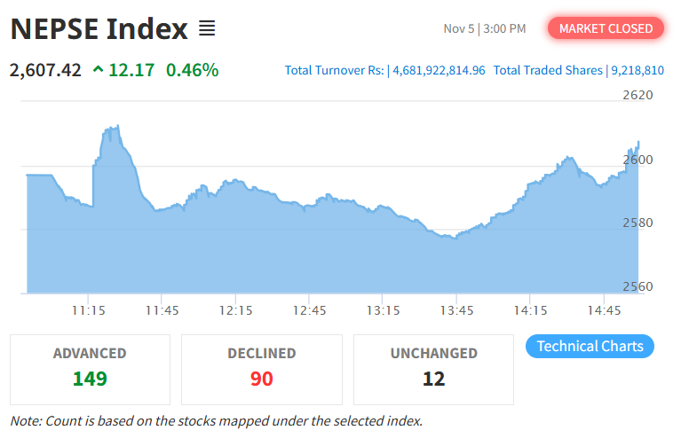 यस दिन नेप्से परिसूचक १२.१७ अंक बढेर २६०७.४२ विन्दुमा पुगेको छ। त्यस्तै, यस दिन सेन्सेटिभ इण्डेक्स १.१४ अंक बढेको छ भने फ्लोट इण्डेक्स ०.९० अंक र सेन्सेटिभ फ्लोट इण्डेक्स ०.४५ अंक बढेको छ।
