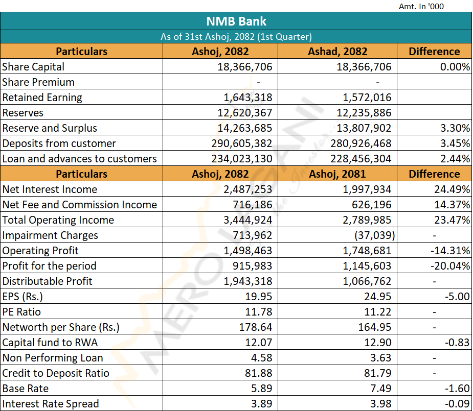 समीक्षा अवधिमा बैंकको खुद ब्याज आम्दानी २४.४९ प्रतिशत र खुद फि तथा कमिशन आम्दानी १४.३७ प्रतिशत बढेको छ। त्यस्तै, बैंकको कुल सञ्चालन आम्दानी समीक्षा अवधिमा २३.४७ प्रतिशत बढेको छ भने सञ्चालन मुनाफा १४.३१ प्रतिशत घटेको छ। बैंकको इम्पेरमेन्ट चार्ज बढेर ७१ करोड ३९ लाख रुपैयाँ पुगेसँगै खुद नाफा र सञ्चालन मुनाफा घट्न पुगेको हो। साे अवधिसम्ममा बैंककाे वितरणयाेग्य मुनाफा १ अर्ब ९४ कराेड रूपैयाँ रहेकाे छ।