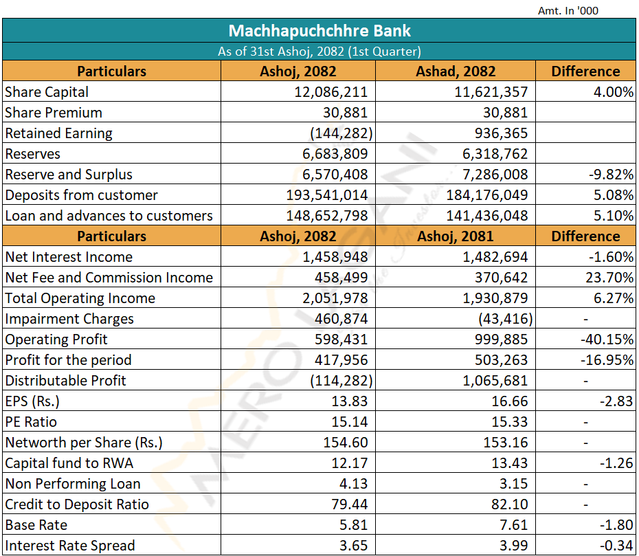 समीक्षा अवधिमा बैंकको खुद ब्याज आम्दानी १.६० प्रतिशत घटेको छ भने खुद फि तथा कमिशन आम्दानी २३.७० प्रतिशत बढेको छ। त्यस्तै, बैंकको कुल सञ्चालन आम्दानी समीक्षा अवधिमा ६.२७ प्रतिशत बढेको छ भने सञ्चालन मुनाफा ४०.१५ प्रतिशत घटेको छ। बैंकको इम्पेरमेन्ट चार्ज बढेर ४६ करोड ८ लाख रुपैयाँ पुगेसँगै खुद नाफा र सञ्चालन मुनाफा घट्न पुगेको हो। सो अवधिसम्ममा बैंकको वितरणयोग्य मुनाफा ११ करोड ४२ लाख रुपैयाँ ऋणात्मक रहेको छ।