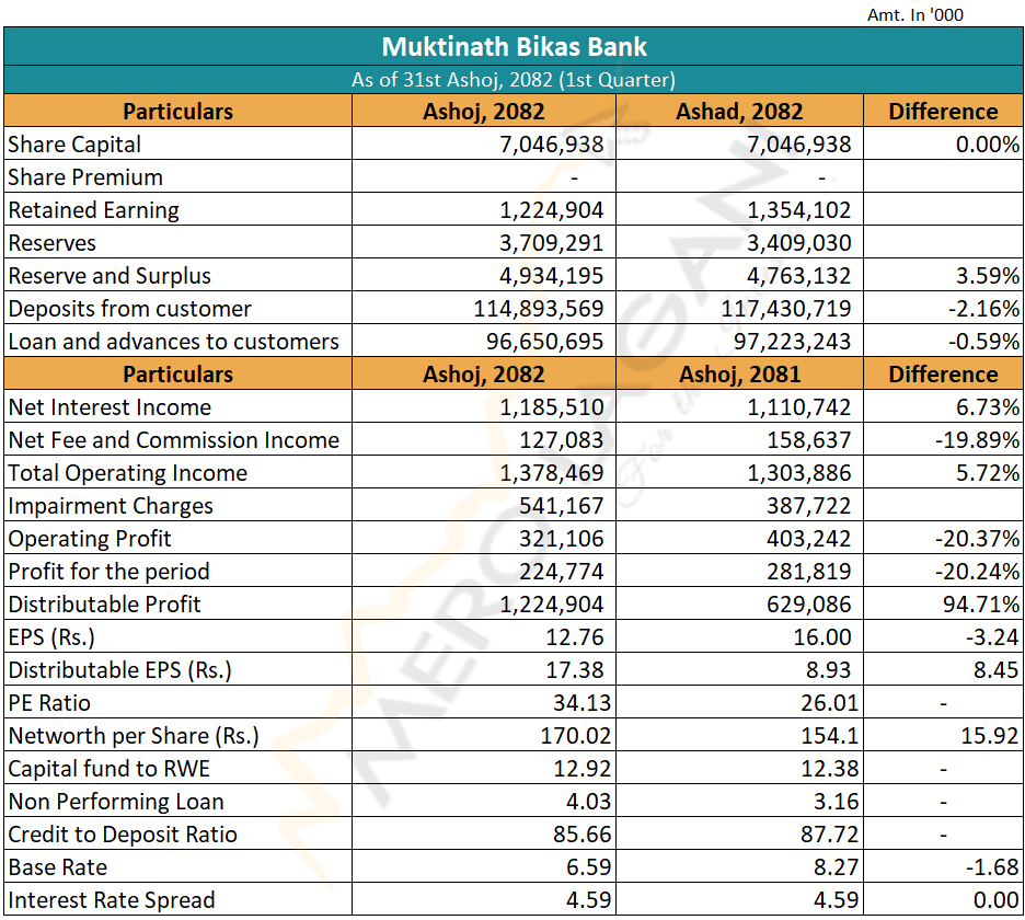 मुक्तिनाथ विकास बैंक लिमिटेड (MNBBL) ले चालु आर्थिक वर्षको पहिलो त्रैमाससम्मको अपरिष्कृत वित्तीय विवरण प्रकाशित गरेको छ। विवरण अनुसार बैंकले सो अवधिसम्ममा १ अर्ब २२ करोड रुपैयाँ वितरणयोग्य मुनाफा कमाएको छ।