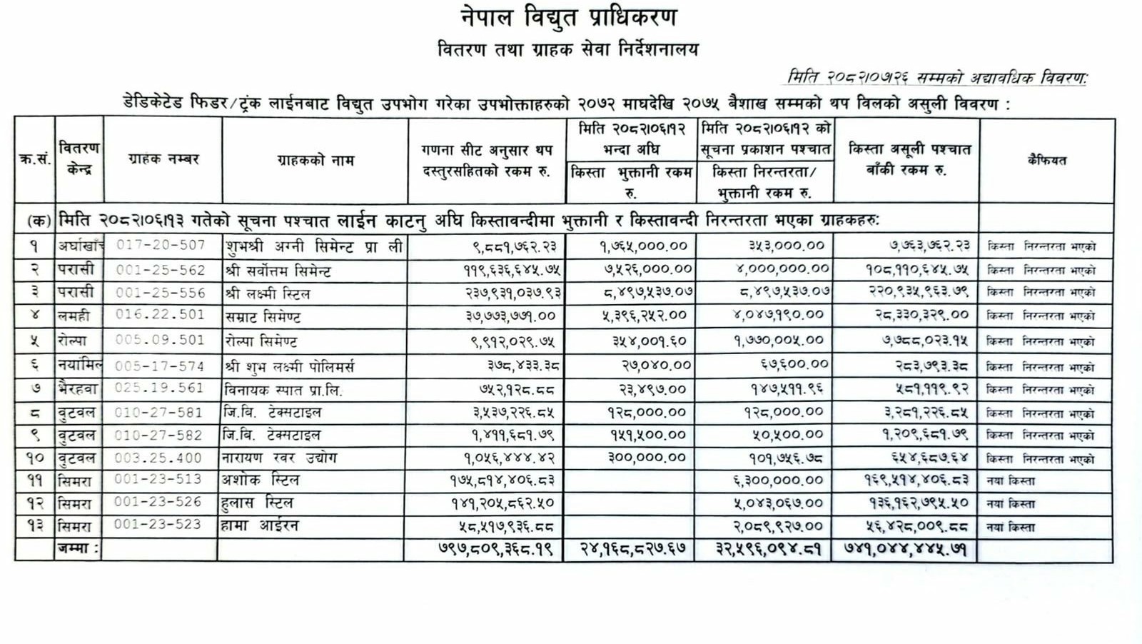 प्राधिकराण्का अनुसार, डेडिकेटेड तथा ट्रंक लाइन संरचनाबाट विद्युत उपभोग गरेका ती उद्योगले पहिलो किस्ता र किस्ताबन्दीलाई निरन्तरता दिएसँगै २३ करोड ८७ लाख ७२ लाख रुपैयाँ महशुल बक्यौता असुलउपर गरेको हो ।