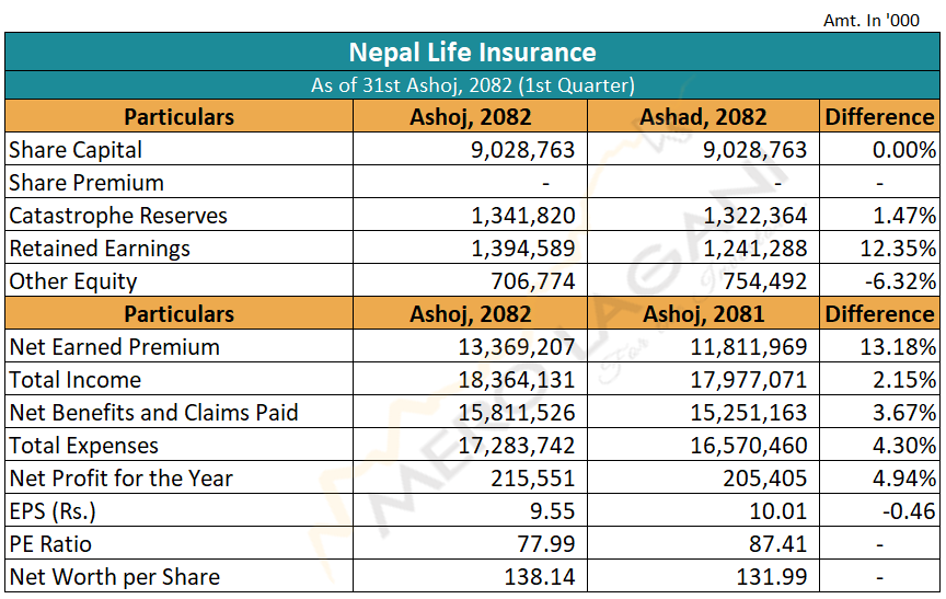 समीक्षा अवधिमा इन्स्योरेन्सको खुद आर्जित बीमाशुल्क १३.१८ प्रतिशत बढेको छ भने कुल आम्दानी २.१५ प्रतिशत बढेको छ। त्यस्तै, इन्स्योरेन्सको खुद दाबी भुक्तानी ३.६७ प्रतिशत र कुल खर्च ४.३० प्रतिशत बढेको छ।