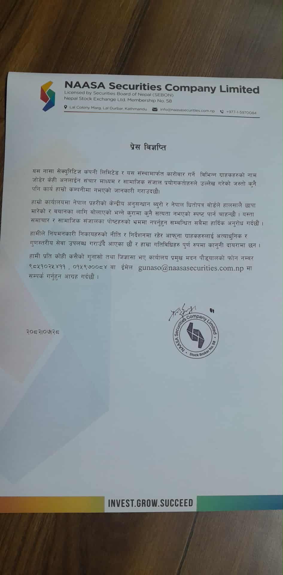 'यस नासा सेक्युरिटिज कम्पनी लिमिटेड र यस संस्थामार्फत कारोबार गर्ने विभिन्न ग्राहकहरुको नाम जोडेर केही अनलाईन संचार माध्यम र सामाजिक संजाल प्रयोगकर्ताहरुले उल्लेख गरेको जस्तो कुनै पनि कार्य हाम्रो कम्पनीमा नभएको जानकारी गराउदछौ,' बिज्ञप्तिमा भनिएकाे छ, ' हाम्रो कार्यालयमा नेपाल प्रहरीको केन्द्रीय अनुसन्धान ब्युरो र नेपाल धितोपत्र बोर्डले हालसालै छापा मारेको र बयानका लागि बोलाएको भन्ने कुरामा कुनै सत्यता नभएको स्पष्ट पार्न चाहन्छौ । यस्ता समाचार र सामाजिक संजालका पोष्टहरुको भ्रममा नपर्नुहुन सम्बन्धित सबैमा हार्दिक अनुरोध गर्दछौं । हामीले नियमनकारी निकायहरुको नीति र निर्देशनमा रहेर आफ्ना ग्राहकहरुलाई अत्याधुनिक र गुणस्तरीय सेवा उपलब्ध गराउँदै आएका छौं र हाम्रा गतिविधिहरु पुर्ण रुपमा कानुनी दायरामा छन । हामी प्रति कोही कसैको गुनासो तथा जिज्ञासा भए कार्यालय प्रमुख मदन पौड्यालको फोन नम्बर ९८५१०२५४११ , ०१५९७००८४ वा ईमेल gunaso@naasasecurities.com.np मा सम्पर्क गर्नुहुन आग्रह गर्दछौं ।'