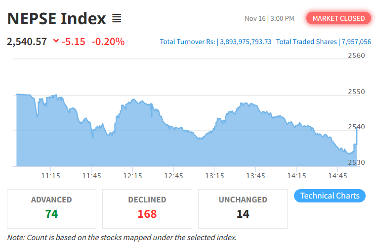 आइतबार नेप्से परिसूचक ५.१५ अंक घटेर २५४०.५७ विन्दुमा झरेको छ। त्यस्तै, यस दिन सेन्सेटिभ इण्डेक्स १.४४ अंक घटेको छ भने फ्लोट इण्डेक्स ०.५० अंक र सेन्सेटिभ फ्लोट इण्डेक्स ०.५६ अंक घटेको छ।