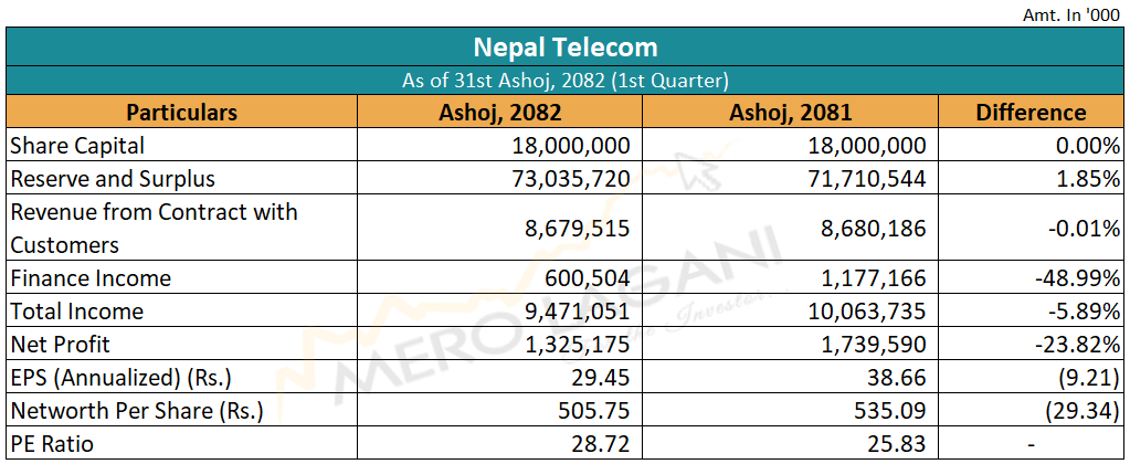 चालु आर्थिक वर्षको पहिलो त्रैमाससम्ममा कम्पनीले १ अर्ब ३२ करोड रुपैयाँ खुद नाफा आर्जन गरेको छ। यो गत आर्थिक वर्षको सोही अवधिको तुलनामा २३.८२ प्रतिशत कम हो। गत आर्थिक वर्षको सोही अवधिसम्ममा कम्पनीले १ अर्ब ७३ करोड ९५ लाख रुपैयाँ खुद नाफा कमाएको थियो।
