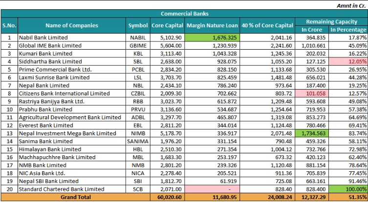 लुनियाले मात्रै होइन सामाजिक सञ्जाल मार्फत पनि केही लगानीकर्ताले उही विषय उठाइरहेका छन्। के कोर क्यापिटलको सीमाले फरक नपारेकै हो ? मेरो लगानीले वाणिज्य बैंकहरुको कोर क्यापिटल, त्यसको ४० प्रतिशत हुन आउने रकम र अहिलेसम्म बैंकले प्रवाह गरेको मार्जिन कर्जालाई गणना गरेर हेरेको छ । यसरी हेर्दा केही बैंकको शेयर धितो कर्जा दिने क्षमता निक्कै कम देखिएको छ भने केही बैंकको क्षमता अझै पनि निक्कै धेरै देखिएको छ।