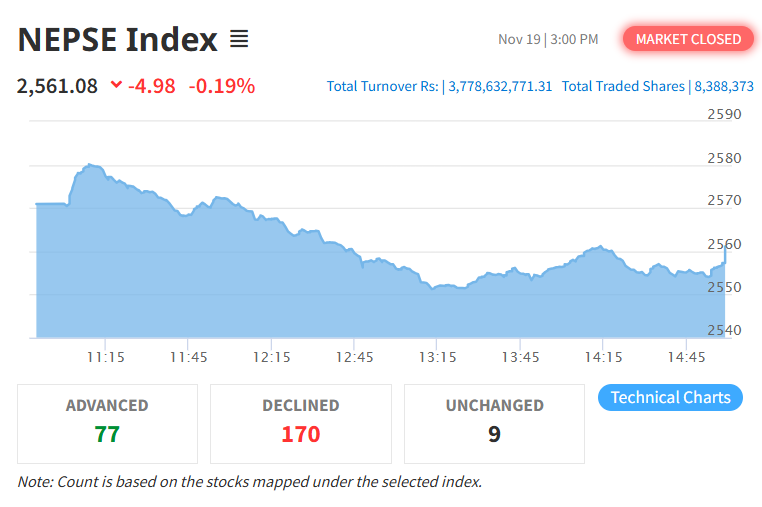यस दिन नेप्से परिसूचक ४.९८ अंक घटेर २५६१.०८ विन्दुमा झरेको छ। त्यस्तै, यस दिन सेन्सेटिभ इण्डेक्स १.२६ अंक घटेको छ भने फ्लोट इण्डेक्स ०.५१ अंक र सेन्सेटिभ फ्लोट इण्डेक्स ०.४५ अंक घटेको छ।